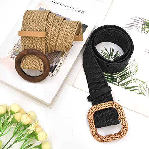 DUOXIN 2 Stuks Stro Geweven Elastische Stretch Taille Riemen, Mode Boho Dames Gevlochten Riem Etnische Stijl Geweven Riem Brede Jurk Riem Voor Vrouwen Meisjes, Zwart+bruin