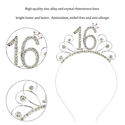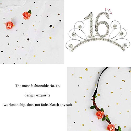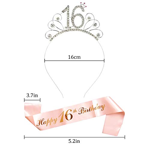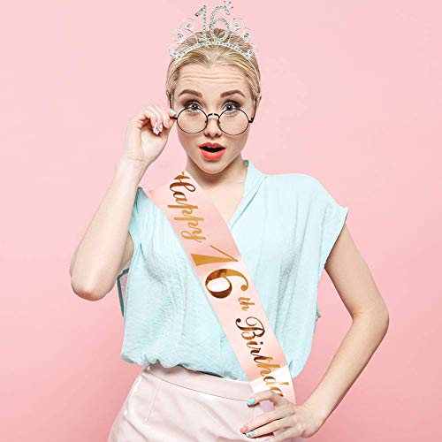 Waardige 16e verjaardag pakket voor meisjes pakket bevat 1 x metalen strass 16e verjaardag tiara hoofdband, 1 x rose goud Happy 16e verjaardag sjerp, noodzakelijke partij accessoires voor uw 16e verjaardag feest decoratie meisje rose goud.