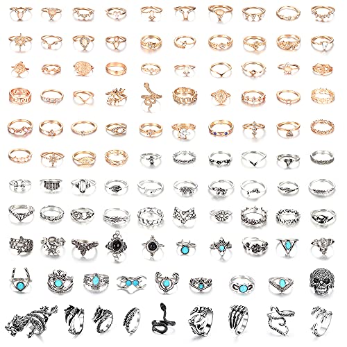 ♥ Verschillende ringstijlen♥ een set van 108 vintage ringen, 53 gouden scharnierringen, 10 punkringen en 45 vintage zilveren ringen. Inclusief: turkooisring, strassring, slangenring, drakklauwring, octopusring, enz. Verschillende ontwerpen om elke dag aan je verschillende eisen te voldoen. Ze worden geleverd met een fluwelen zakje waarin je je sieraden kunt opbergen. Met deze retro ringsets zie je er cool en charmant uit.