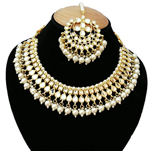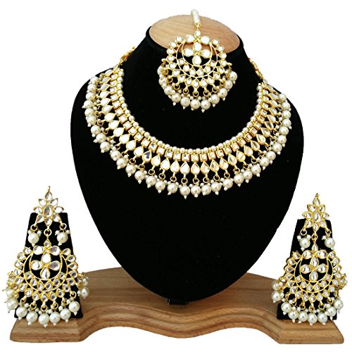 Specification: Finekraft Meena Kundan Parels Designer Vergulde Bruids Bruiloft Vrouwen Ketting, Oorbellen, Tikka Sieraden Set